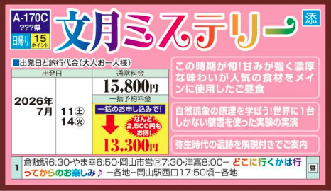 | 1 | 倉敷駅(6:30)・やま幸(6:50)・岡山市営(7:30)・津高(8:00) |