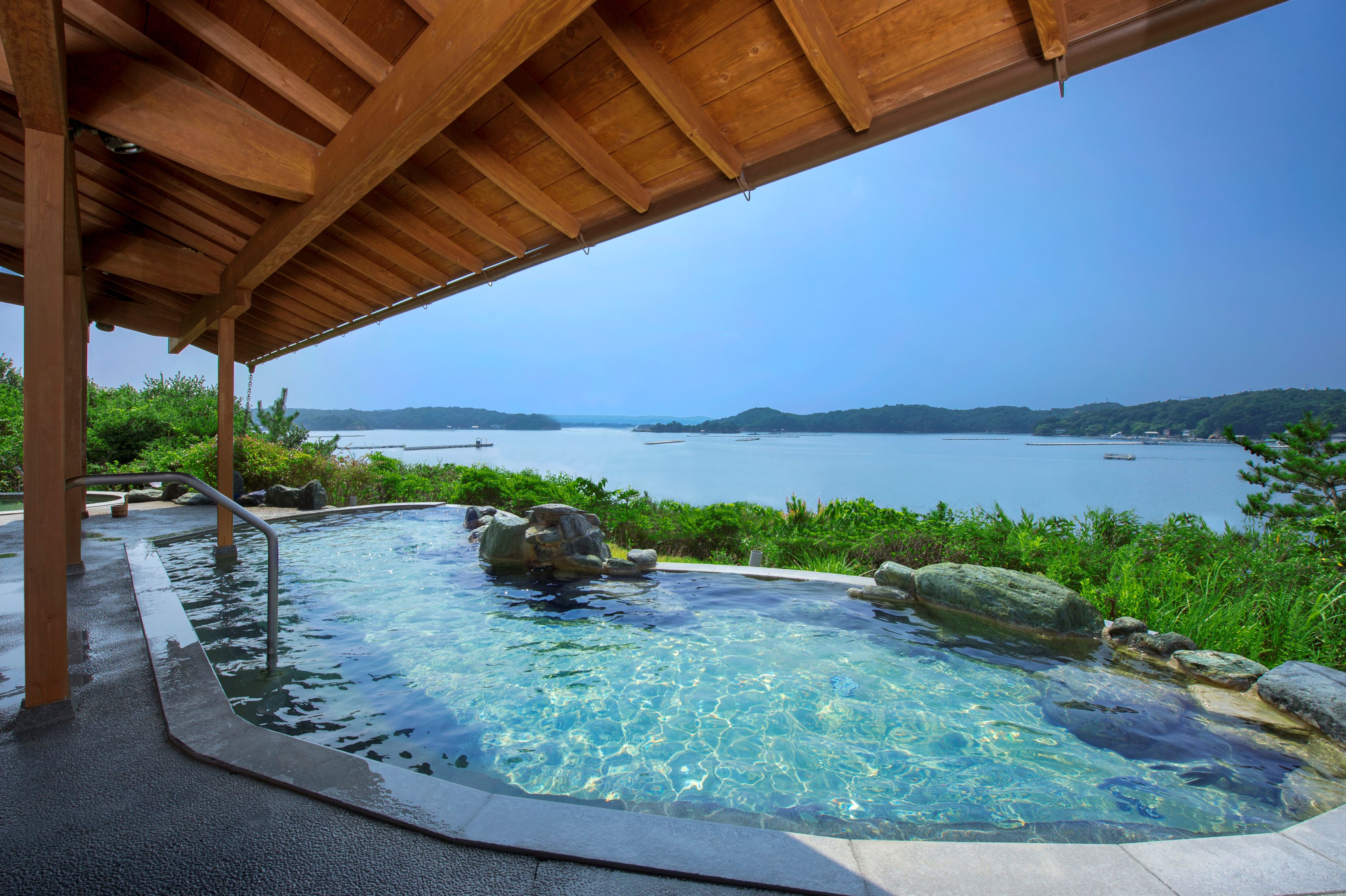 真珠を育むリアス式の美しい海岸、英虞湾に囲まれて佇む和風旅館。賢島の源泉を引き込んだ天然温泉「朝なぎの湯、夕なぎの湯」からは海を一望する絶景を愉しめます。