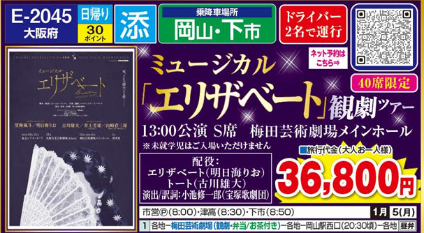 | 1 | 興除車庫(7:00)==岡山市営駅南P(8:00)==シモデン津高駐車場(8:30)==山陽HW==シモデン下市駐車場(8:50)==中国.阪神HW==梅田ランプ==梅田芸術劇場メインホール(13:00公演 S席でご観劇/弁当昼食)==梅田ランプ==阪神.中国.山陽HW==シモデン下市P(19:50頃)==山陽HW==シモデン津高P(20:10頃)==岡山駅西口(20:30頃)==興除車庫(21:10頃) |