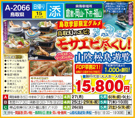 A2066【倉敷ルート】鳥取幻のエビ!モサエビ尽くし!山陰松島遊覧