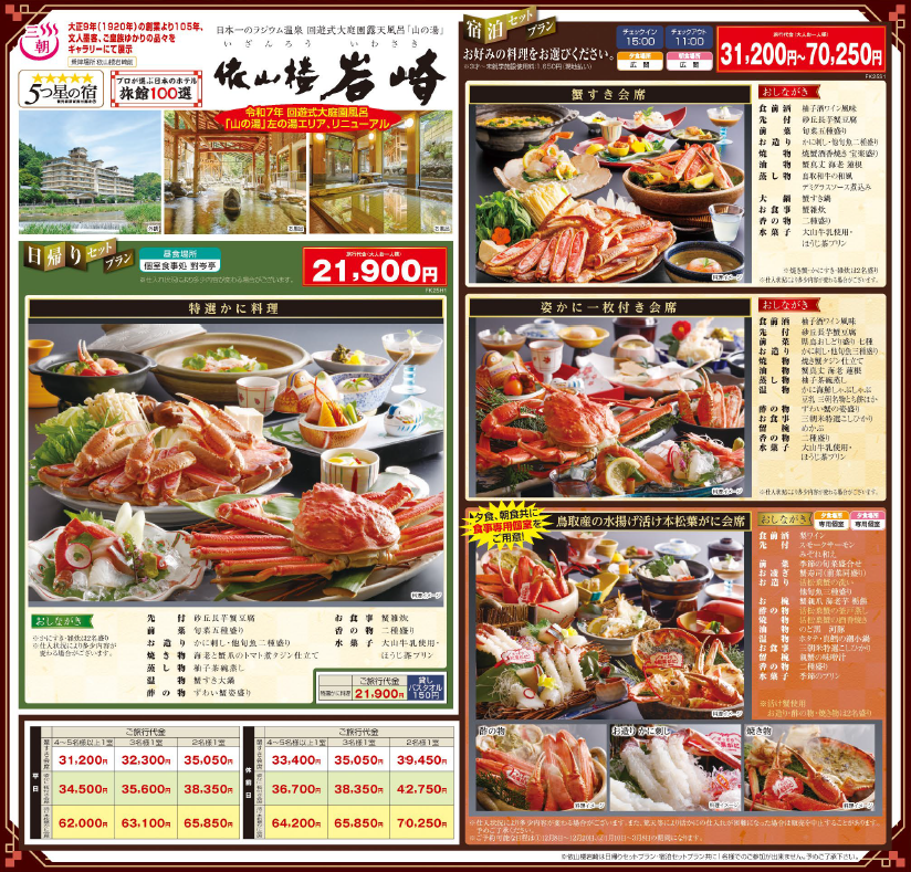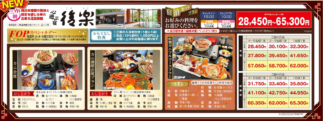 三朝温泉カニバス宿泊・三朝温泉後楽(1泊につき2食付+往復バスセット)