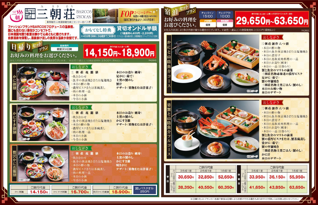 日帰りセットプラン・宿泊セットプラン・温泉入浴券付き往復バスの3種類からお選び下さい!