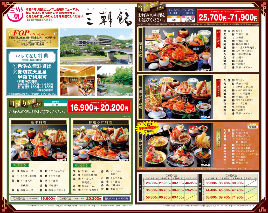 三朝温泉カニバス宿泊・三朝館(1泊につき2食付+往復バスセット)