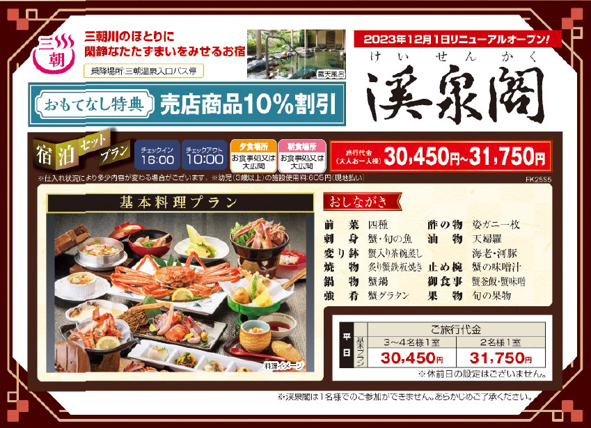 三朝温泉カニバス宿泊・渓泉閣(1泊につき2食付+往復バスセット)