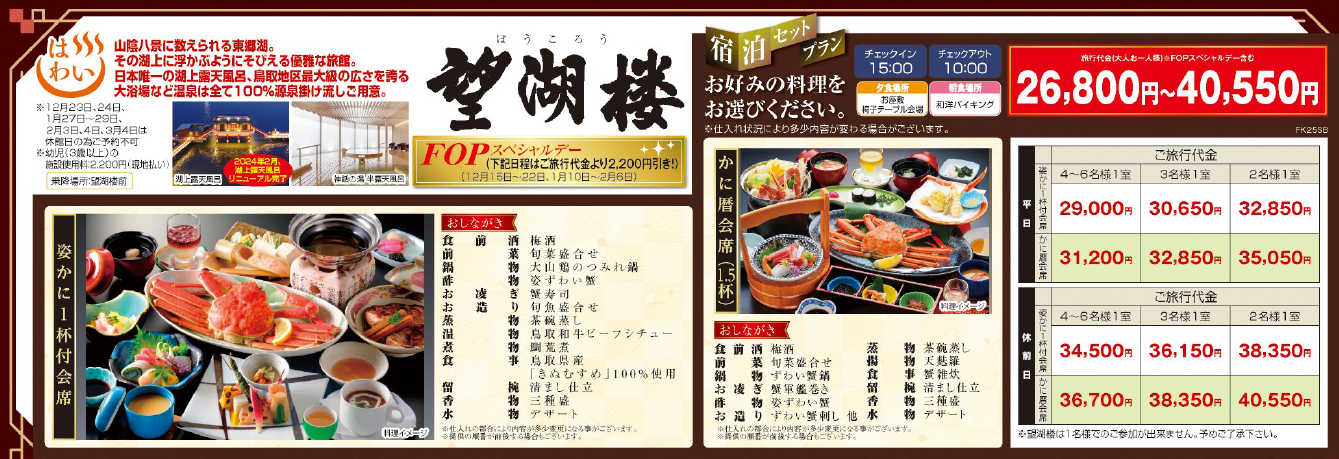 三朝・はわい温泉カニバス宿泊・望湖楼(1泊につき2食付+往復バスセット)