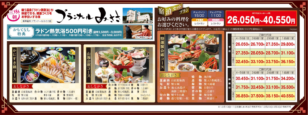 三朝温泉カニバス宿泊・ブランナールみささ(1泊につき2食付+往復バスセット)