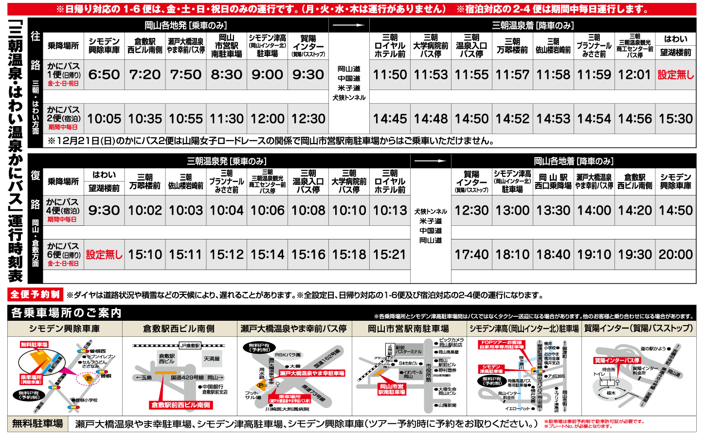 シモデン興除車庫・倉敷駅西ビル南側・瀬戸大橋温泉やま幸・岡山市営駅南駐車場(復路は岡山駅西口下車)・シモデン津高駐車場・賀陽ICバスストップ