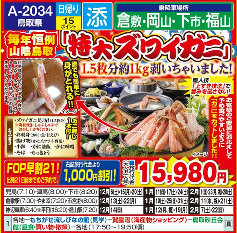 | 1 | 興除車庫(6:20)-児島(6:50)-倉敷駅(7:40)-橋立やまいち(丹後漁師料理の昼食・買い物)-伊根湾めぐり遊覧船(伊根の舟屋巡り)-道の駅和(休憩)-美山かやぶきの里(冬灯籠・夕食自由食)-各地(22:20〜24:00) |