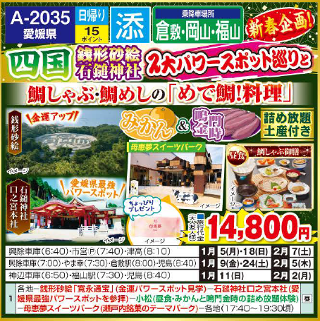 | 1 | 各地==瀬戸大橋・高松HW==銭形砂絵「寛永通宝」(金運パワースポット見学 ※展望台へは各自/徒歩約15分)9:40〜10:20==高松・松山HW==石鎚神社口之宮本社(石鎚神社の拠点。愛媛県最強パワースポットを参拝)11:20〜12:00==小松(鯛しゃぶと鯛めしの“めで鯛御膳”昼食/みかんと鳴門金時の詰め放題体験)12:20〜14:20==母恵夢スイーツパーク(瀬戸内銘菓のテーマパーク)14:45〜15:15==松山・高松HW==豊浜SA(休憩)==瀬戸大橋==各地 |