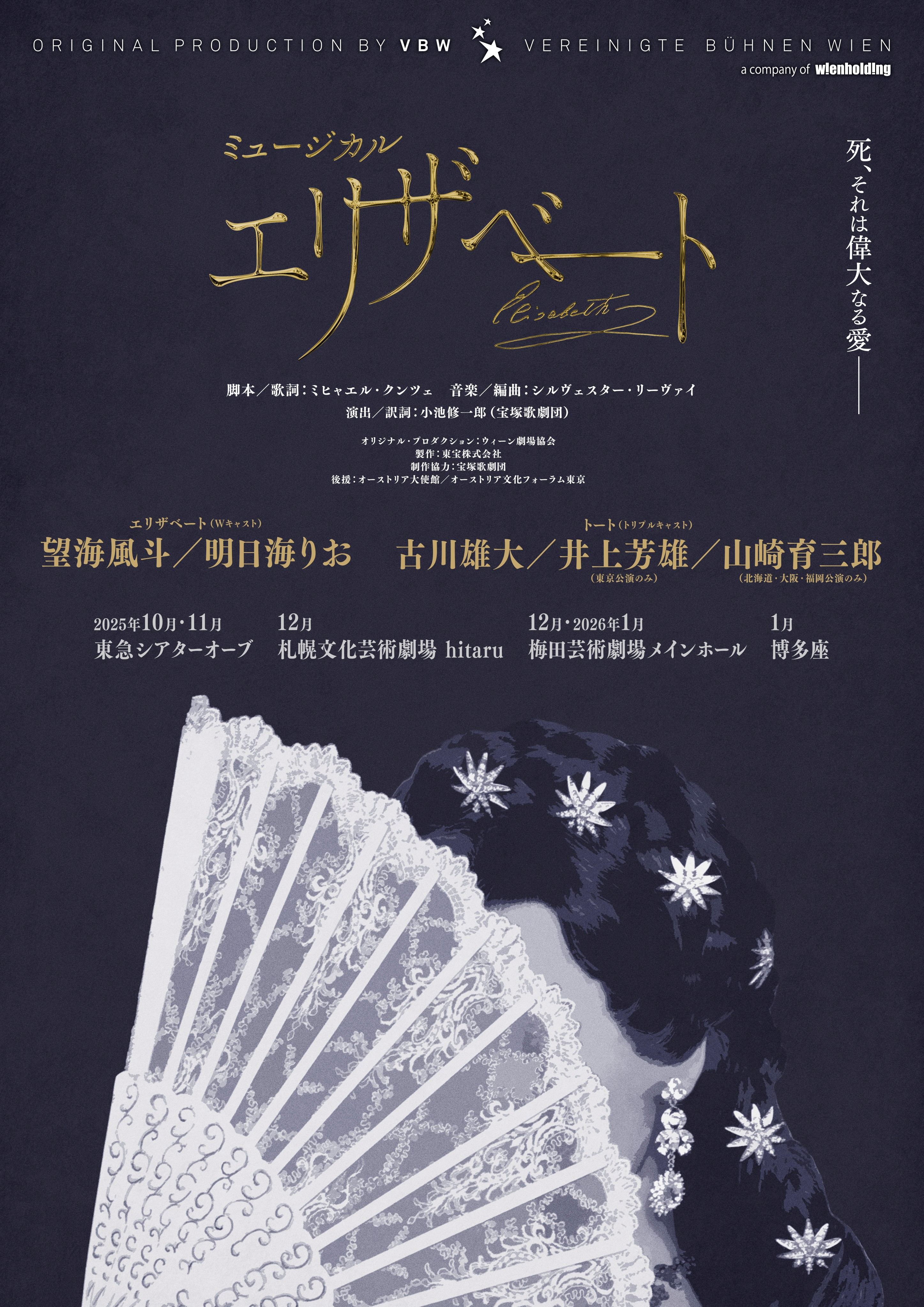 エリザベート(明日海りお)、トート(古川雄大)、フランツ(田代万里生)、ルドルフ(伊藤あさひ)、ゾフィー(香寿たつき)、ルキーニ(黒羽麻璃央)